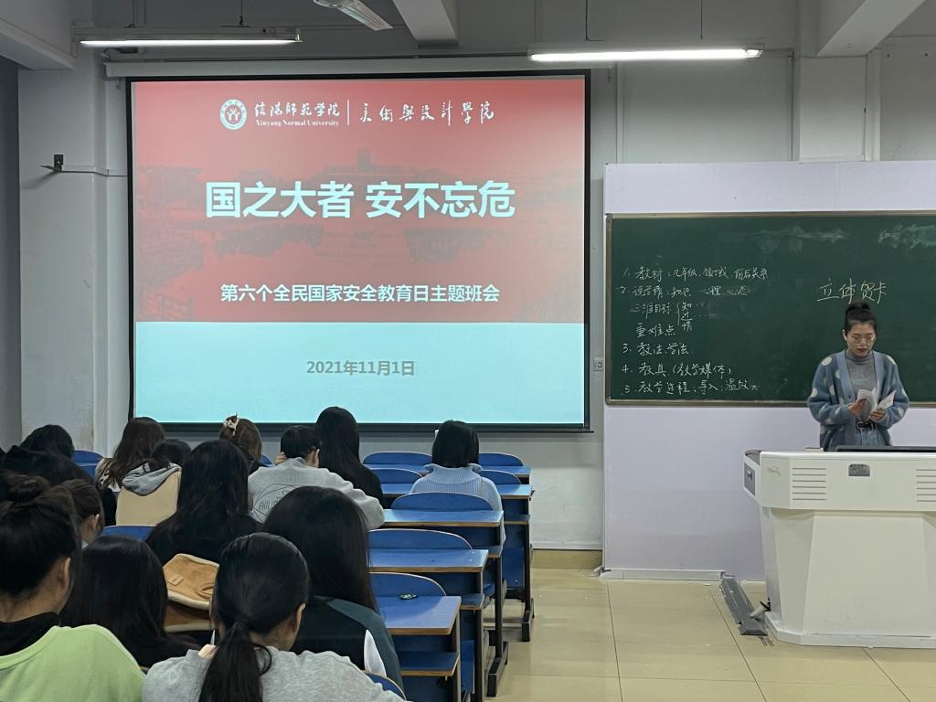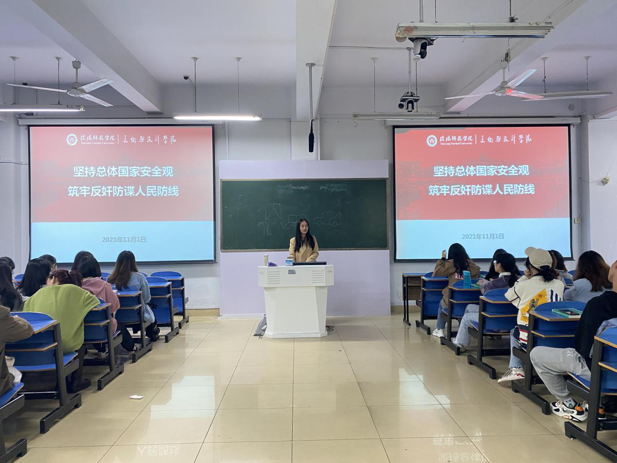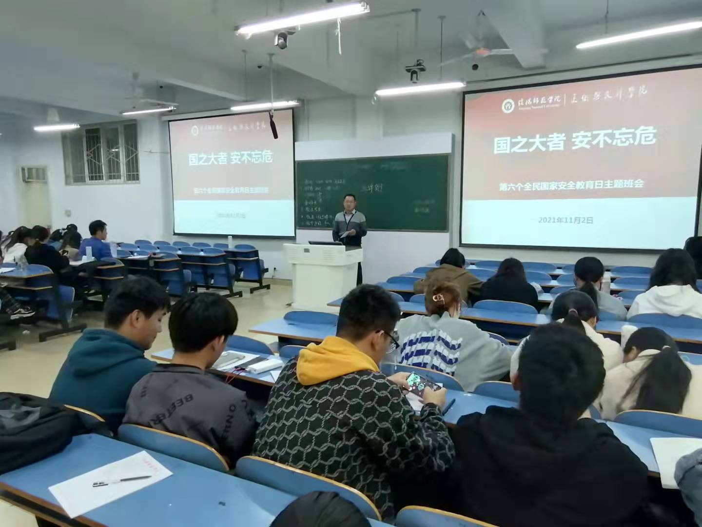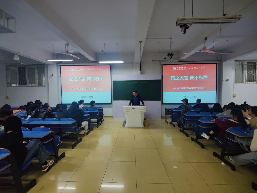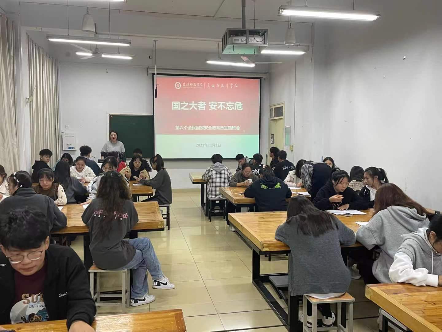 2021年4月15日,是第六个全民国家安全教育日,同时,今年11月1日是反间谍法颁布施行7周年纪念日。反间谍法是我国国家安全法律制度体系的重要组成部分。所谓有国才有家,国家安全靠大家。维护国家安全,荣誉和利益是每个公民组织应尽的义务,全社会需自觉维护国家安全利益,保证国家长治久安。为了增强同学们的国家安全意识,树立国家利益高于一切,国家安全,人人有责的责任意识,太阳成官网各班班主任于11月2日分别在艺术楼不同教室开展了第六个全民国家安全教育日和“坚持总体国家安全观,筑牢反奸防谍人民防线”为主题两个主题班会。活动由太阳成官网副院长董建义,党委副书记周刚,团委老师郑波,辅导员班主任饶海虹、胡霁芳、明政老师分别主持。
