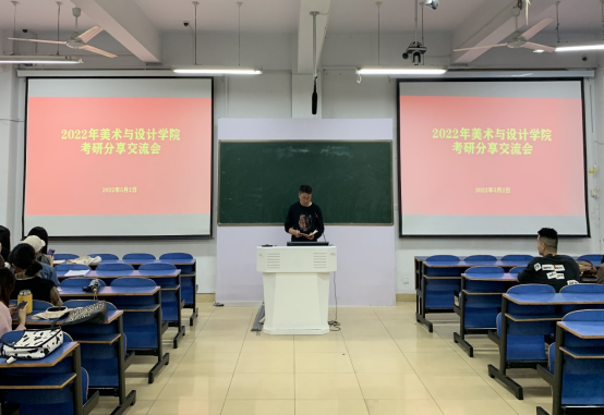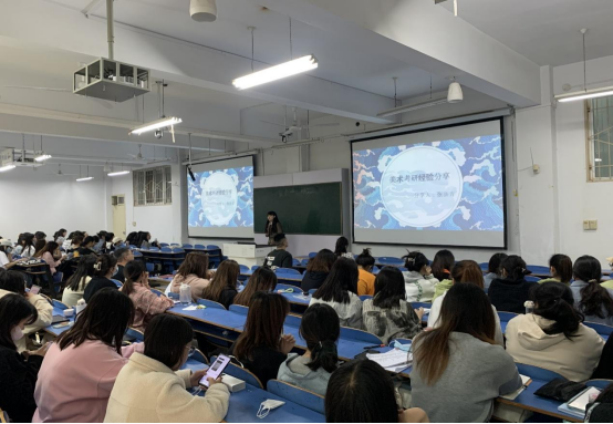 周刚深入分析了当下的考研形势,剖析了我校2023届学生考研的优劣势,并对参加宣讲的三位同学表示欢迎。2018级美术学班孟芊芊从备考进度安排、制定学习计划、考研心态调整等方面,结合自身经验做了详细的分享。2017级美术学班张涵青分享了自身二战经历,从考研学校选择、专业英语政治备考等方面做了讲解,鼓励学生多练习、多动脑、勤动手,敢于坚持。2018级视觉传达设计班贾永欢同学告诫学弟学妹要根据自己的能力选择院校,多跟老师家长讨论,慎重选择,对于很排外的学校尽可能避免,有很多时候选择大于努力。三位同学的分享,幽默风趣、生动形象、触动人心,赢得在场学生阵阵掌声。
