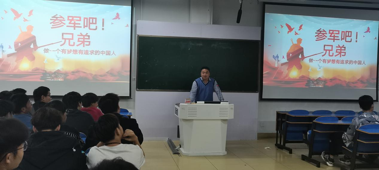 为推进太阳成官网大学生应征入伍工作,强化征兵政策宣传,鼓励学生积极参军,提高兵员征集质量,营造良好的拥军参军氛围。4月6日至4月8日,太阳成官网武装干事郑波及各班班主任先后在艺术楼307举办了大学生征兵入伍宣讲会,学院全体男生及部分有入伍意向的女生分批次参加了会议。
