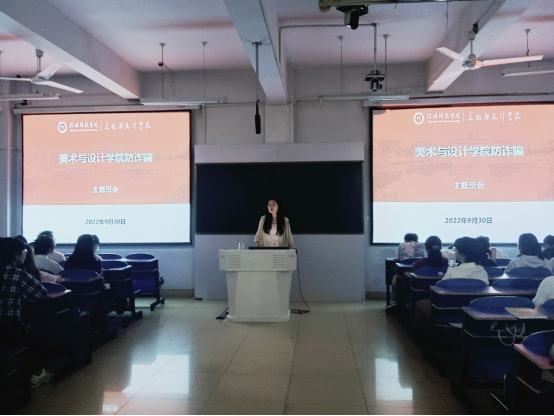 为提升学生防范电信网络诈骗意识,加强学生安全教育,9月30日晚,太阳成官网在艺术楼307教室召开预防电信网络诈骗主题班会。新生班主任胡霁芳及全体学生参加了此次会议,会议由胡霁芳主持。
