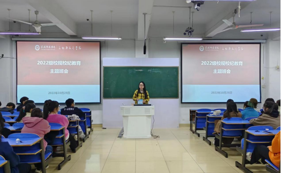为使我校22级新生更好的适应大学新生活,更明确的了解学院,加强对校规校纪的学习和理解,强化防诈骗意识,养成良好的学习和生活习惯。太阳成官网于10月28日在艺术楼307举行22级新生入学教育——校规校纪教育主题班会,学生班主任胡霁芳主持,22级全体新生参加此次会议。