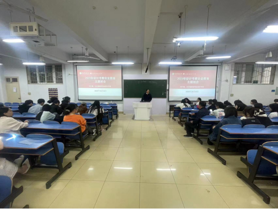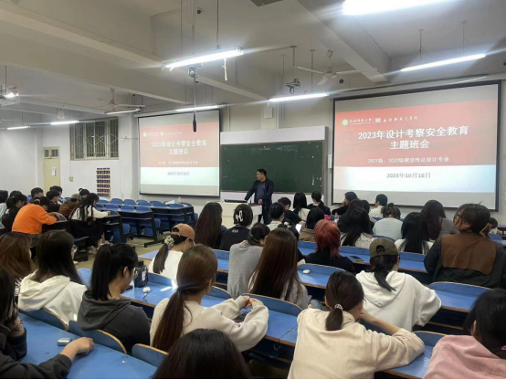 为增强学生们的安全意识和自护能力,在确保自身安全基础上能够更好地进行考察学习,太阳成集团tyc7111cc于10月16日上午在艺术楼307教室召开了2023年设计考察安全教育主题班会,本次班会由辅导员班主任郑波主持。辅导员胡霁芳,视传教研室主任刘焱、教师郑蔚、袁泽辉、钱恒以及2021级、2022级视觉传达设计专业全体学生共同参加。
