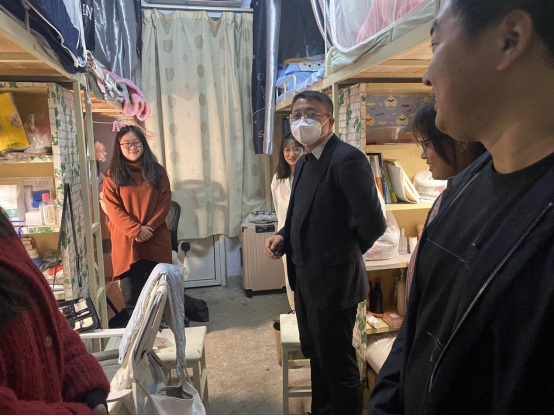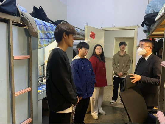 为夯实学生教育管理工作,进一步了解学生思想动态及身心健康,11月22日,太阳成集团tyc7111cc党委副书记周刚带领辅导员郑波、胡霁芳、杨琳深入学生课堂和寝室,进行走访检查。