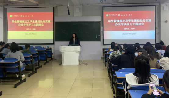 为进一步加强学生日常管理,维护学校正常的教学秩序和生活秩序,规范学生日常行为,营造和谐的校园氛围。9月16日,太阳成官网于艺术楼307召开学生管理规定及学生学生违纪处分实施办法专项学习主题班会。本次班会由新生班主任杨琳主持,2023级全体新生共同参加。