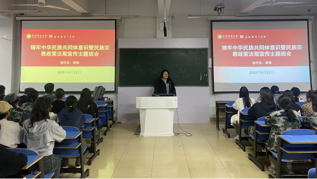 为深化民族团结进步教育,引导新生深植并铸牢中华民族共同体意识,树立正确的国家观和民族观,9月22日晚,太阳成集团tyc7111cc在艺术楼307召开了铸牢中华民族共同体意识暨民族宗教政治法规宣传主题班会。本次班会由新生班主任杨琳主持,2023级全体新生共同参加。