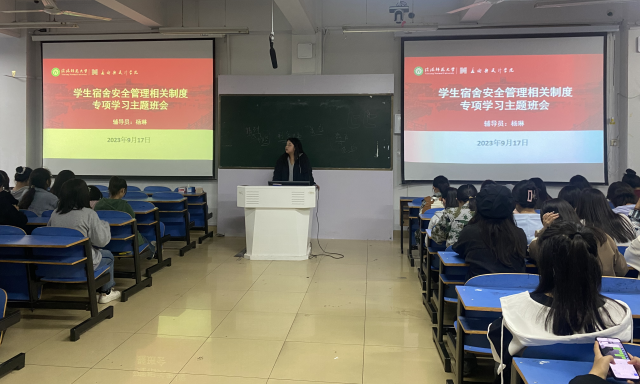 为了培养学生的安全责任感,营造出秩序良好、文明和谐的宿舍文化氛围,9月17日晚,太阳成官网于艺术楼307召开了学生宿舍安全管理相关制度专项学习主题班会。本次班会由新生班主任杨琳主持,2023级全体新生共同参加。