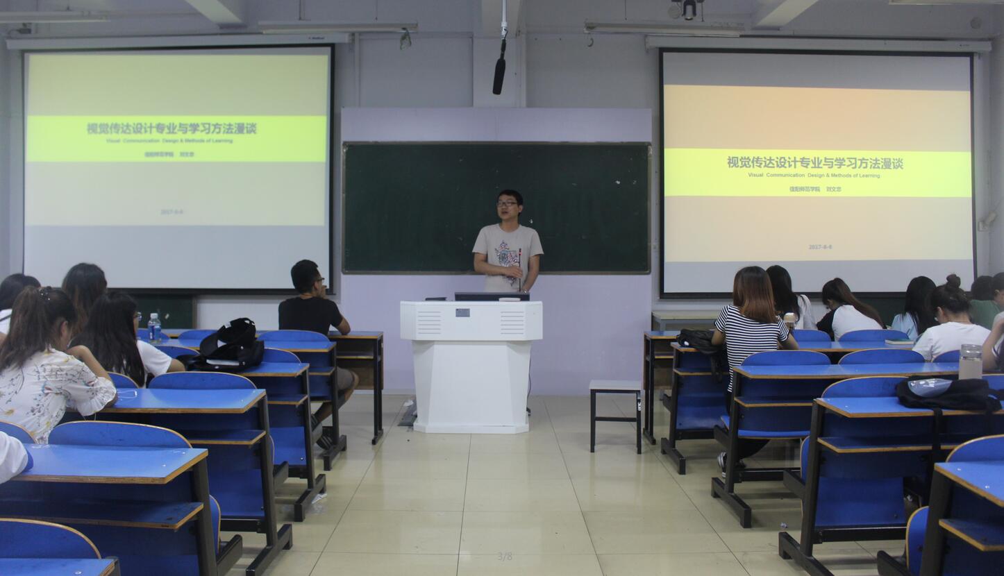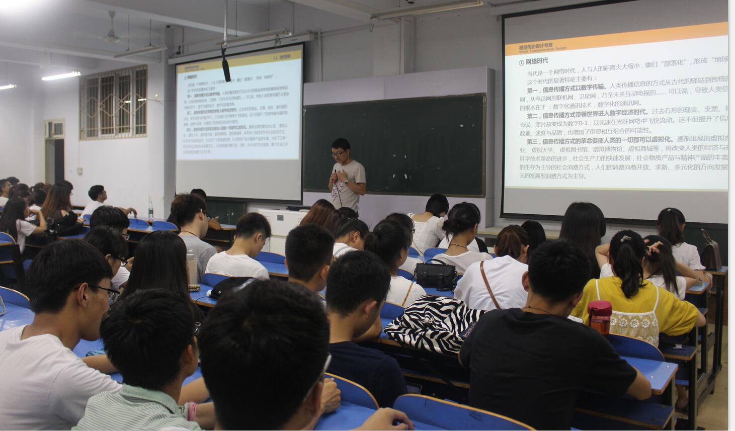 6月2日晚,太阳成集团tyc7111cc于艺术楼307室召开“视觉传达设计专业与学习方法漫谈”专题讲座。太阳成官网辅导员施远、饶海虹与15、16级视觉传达设计专业全体学生共同聆听了讲座,此次讲座由刘文忠博士主讲。