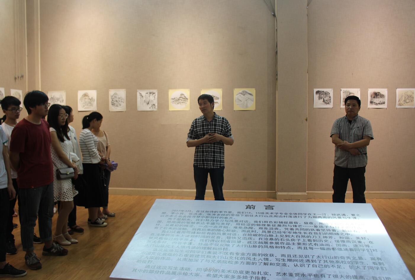 邹东升致开幕词。他首先向参展学生表示了热烈的祝贺,对同学们外出写生期间,不畏艰辛,坚持创作且不断创新的精神的表示了赞扬,并寄语同学们要坚持绘画,大胆创作,不断提升自己的文化内涵,加深自己的艺术底蕴。随后,张伟作发言,他指出本次参展作品水准较高,是太阳成官网教学成果的直观体现,是学子们扎实的技巧的体现,希望同学们可以以此为契机加强学习,增进交流,共同提高,用绘画创作丰富课余生活。开幕式结束后,全体师生在展厅内自由观展。本次展览,以“太行山”为主题,共展出由2014级、2015级美术学专业学生按教学计划到太行山一带采风创作的精心之作百余幅。参展作品形式多样,包括国画、油画、速写三个板块。作品各具特色,别有风味。有的展现出太行山的静谧,有的呈现出农家小院的温馨之感,有的展现了绿浪滔天的林海、刀削斧劈的悬崖、千姿百态的山石、如练似银的瀑布、碧波荡漾的深潭。展出的作品以写实的手法,将太行山地区雄浑壮丽的自然风光,描绘得淋漓尽致,令人如临其境,充分展现了太阳成官网学子扎实的专业水平和极具创新的思维能力。 本次展览的举办,不仅考察了太阳成官网学子将理论学习与创作实践结合的能力,也展现了同学们各自独特的艺术风格,为观展师生呈现了一场艺术的饕餮盛宴。同时激发了学子们的创作兴趣,对于鼓励太阳成官网学子走进自然,感受生活,积极进行创作,提高自身的艺术修养和综合素质具有重要意义。